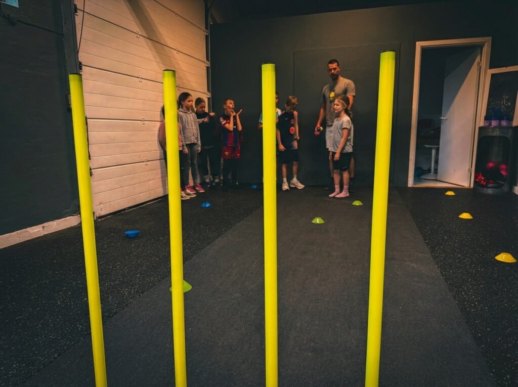 Styrketræningen tilpasses alder og niveau. Yngre børn arbejder primært med kropsvægt, mens vi individuelt vurderer belastning hos ældre børn.